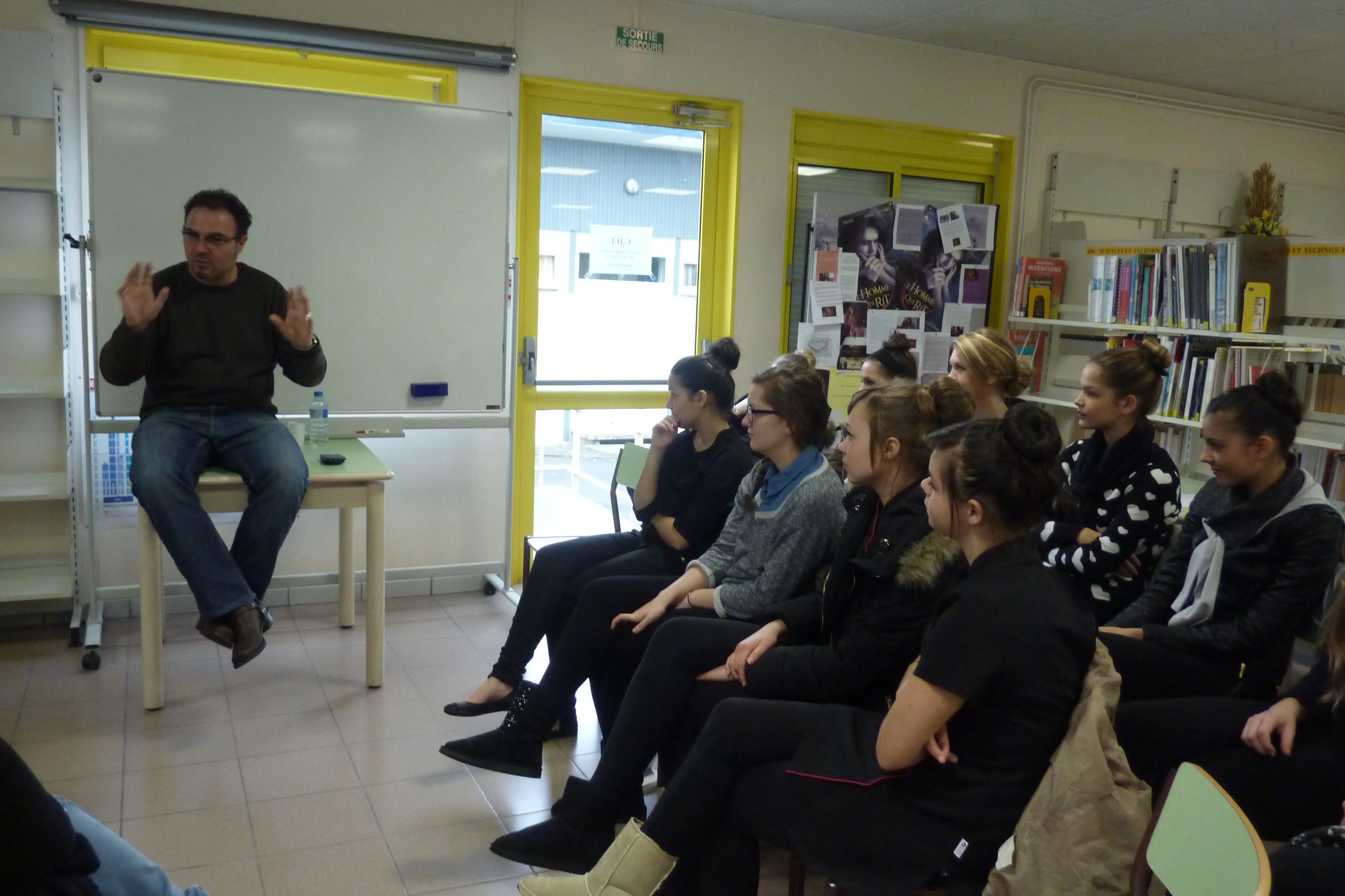 Le lundi 18 novembre 2013, les deux classes de 2de bac pro esthétique ont rencontré l’écrivain Benoît Séverac. Invité par le festival « Noir sur la ville », l’auteur toulousain a fait un détour par Guingamp pour présenter son travail d’écriture et répondre aux questions de nos élèves.